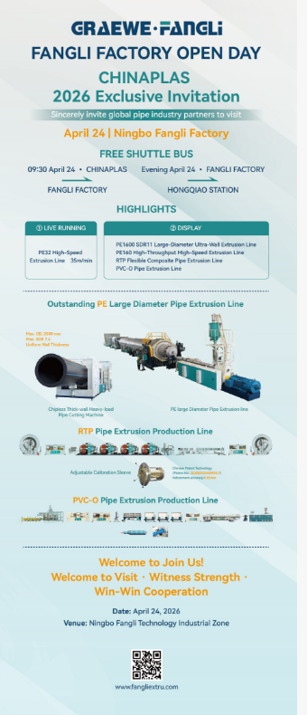 Från 21 till 24 april på CHINAPLAS 2026, besök Fangli Technology på monter 7.1C14. Låt oss utforska innovation och framtida samarbete inom plaströrsutrustning tillsammans!