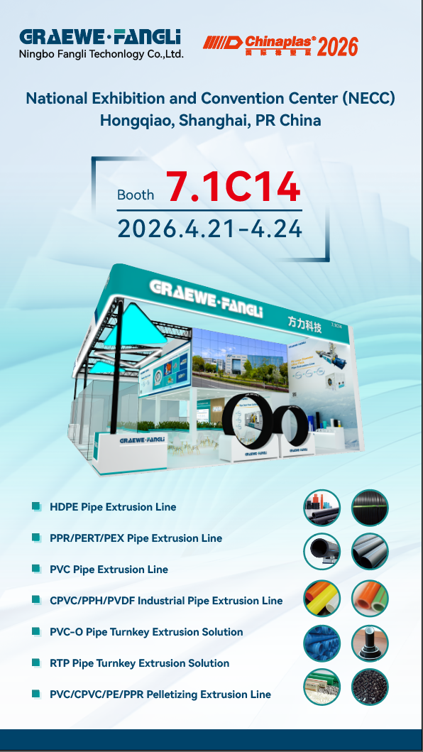 मराठी Välkommen till vår monter 7.1C14 på ChinaPlas 2026,Ningbo Fangli Technology Co., Ltd.(hädanefter kallad "Fangli") är specialiserad på FoU, produktion och försäljning avextruderingsutrustning av plast, nya produktionslinjer för miljöskydd, plaströrsvetsningsmaskiner och plasthjälpmaskiner.